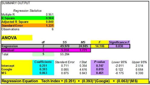 There are many other pieces of information in the Excel regression output but the above four items will give a quick read on the validity of your Regression.