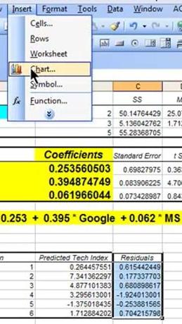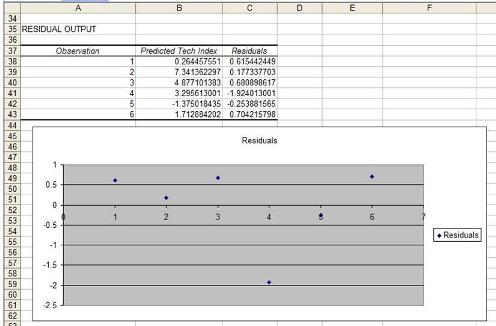 The residuals are the difference between the Regression’s predicted value and the actual value of the output variable. You can quickly plot the Residuals on a scatterplot chart. Look for patterns in the scatterplot. The more random (without patterns) and centered around zero the residuals appear to be, the more likely it is that the Regression equation is valid.